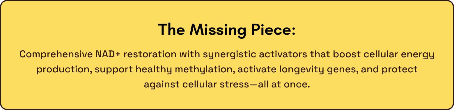 Standard vitamins support general health but don't address NAD+ depletion—the master regulator your cells actually need. Your mitochondria still lack the coenzyme required to produce ATP efficiently.