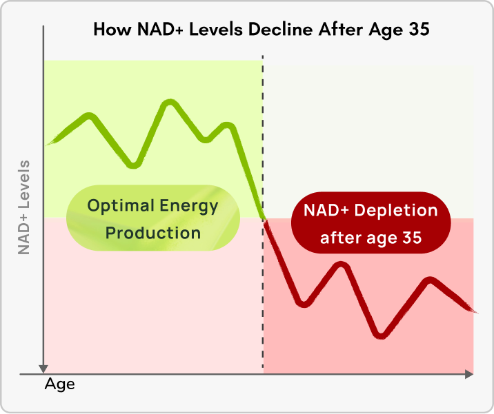 But here's the problem: NAD+ levels decline by up to 50% by age 40. By age 60, they've dropped by 80%.