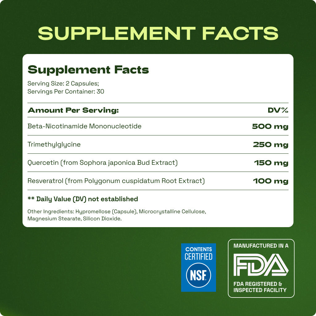 100mg Resveratrol (from Polygonum cuspidatum Root Extract) ā activates SIRT1, the longevity gene that requires NAD+ as a cofactor. Resveratrol increases SIRT1's effectiveness only when adequate NAD+ is present ā which is why it works best paired with NMN.