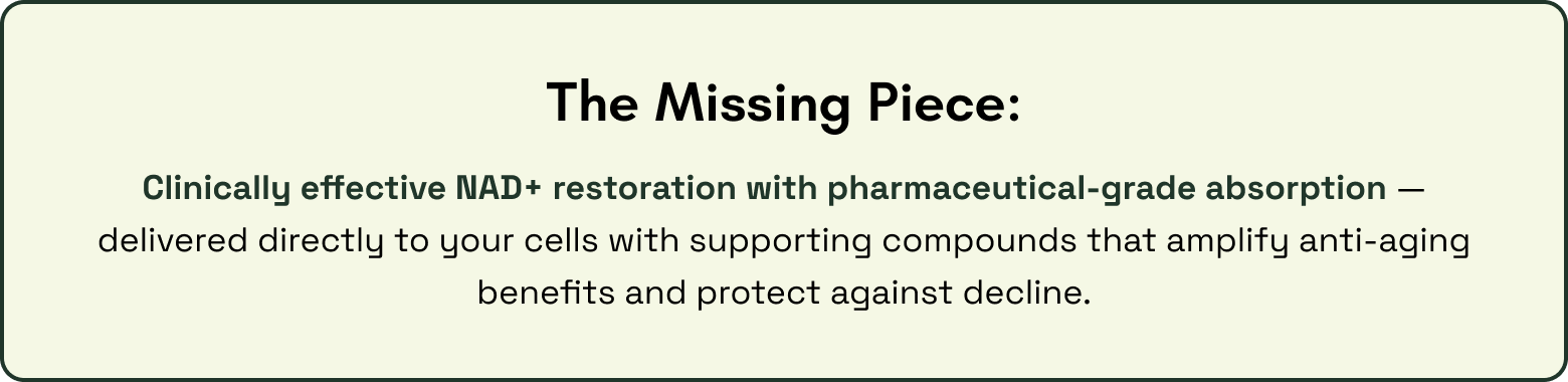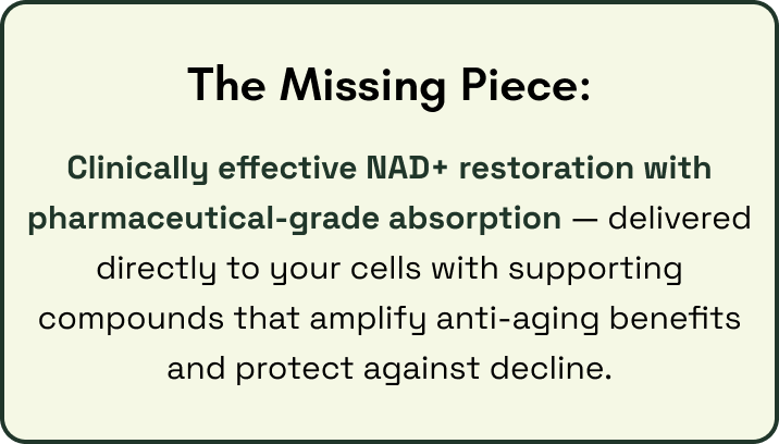 "I've been studying cellular aging for over 15 years, and NAD+ restoration is one of the most scientifically validated interventions we have. The problem is absorption — most NAD+ supplements fail to deliver meaningful amounts to cells.