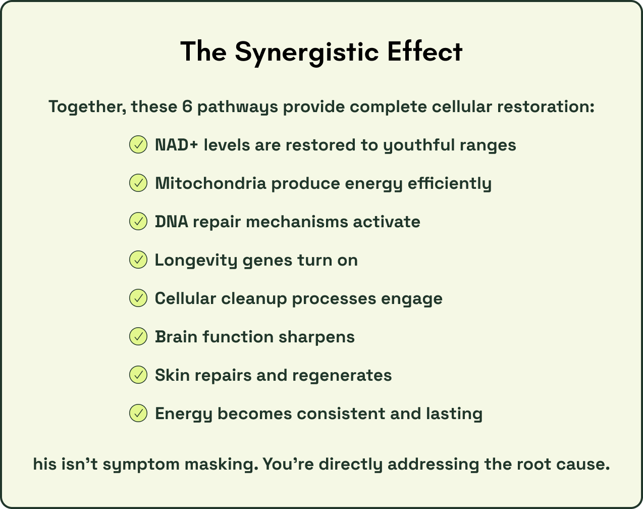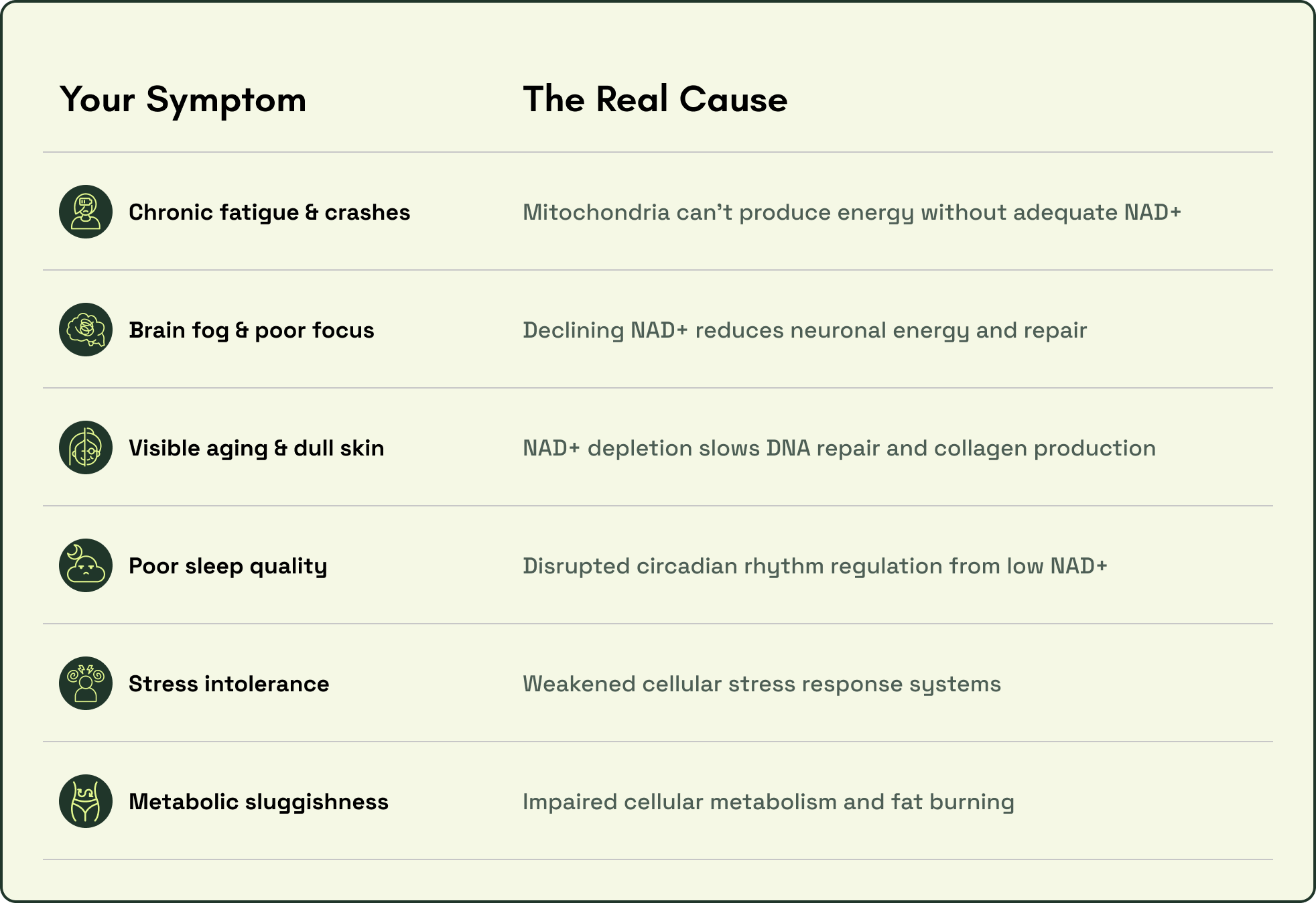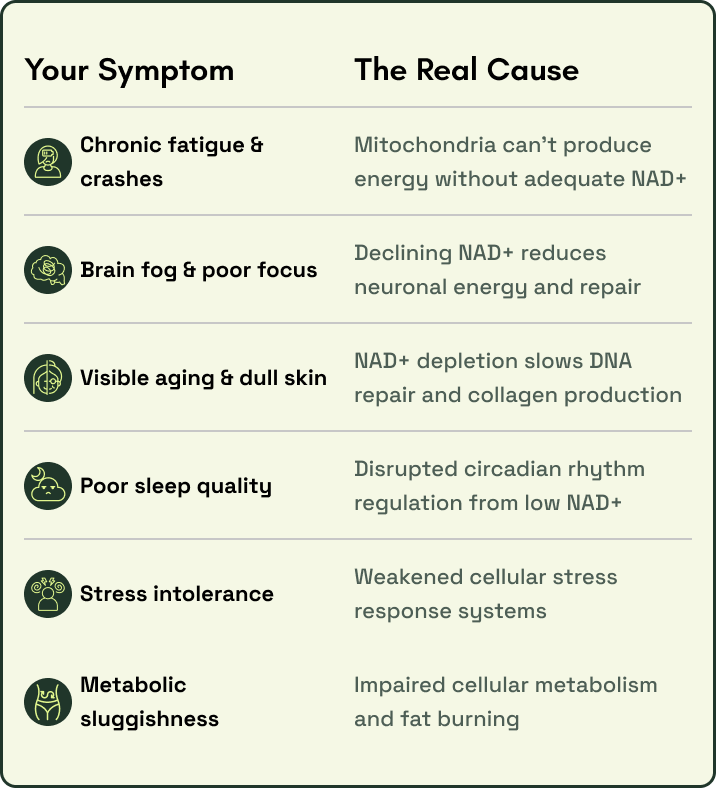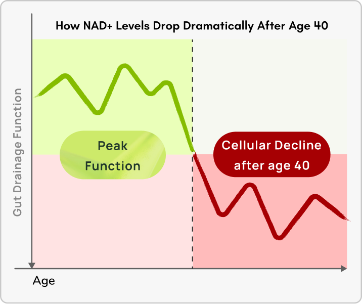 But by age 40, your NAD+ levels plummet by over 50%. This isn't gradual — it's dramatic. And it affects everything. As NAD+ drops: